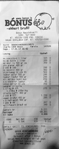 | 1 | ms nýmjólk+d 1 líter | Mjólk | MS nýmjólk, D-vítamínbætt 1L | 165 | 1 | 165 | ||