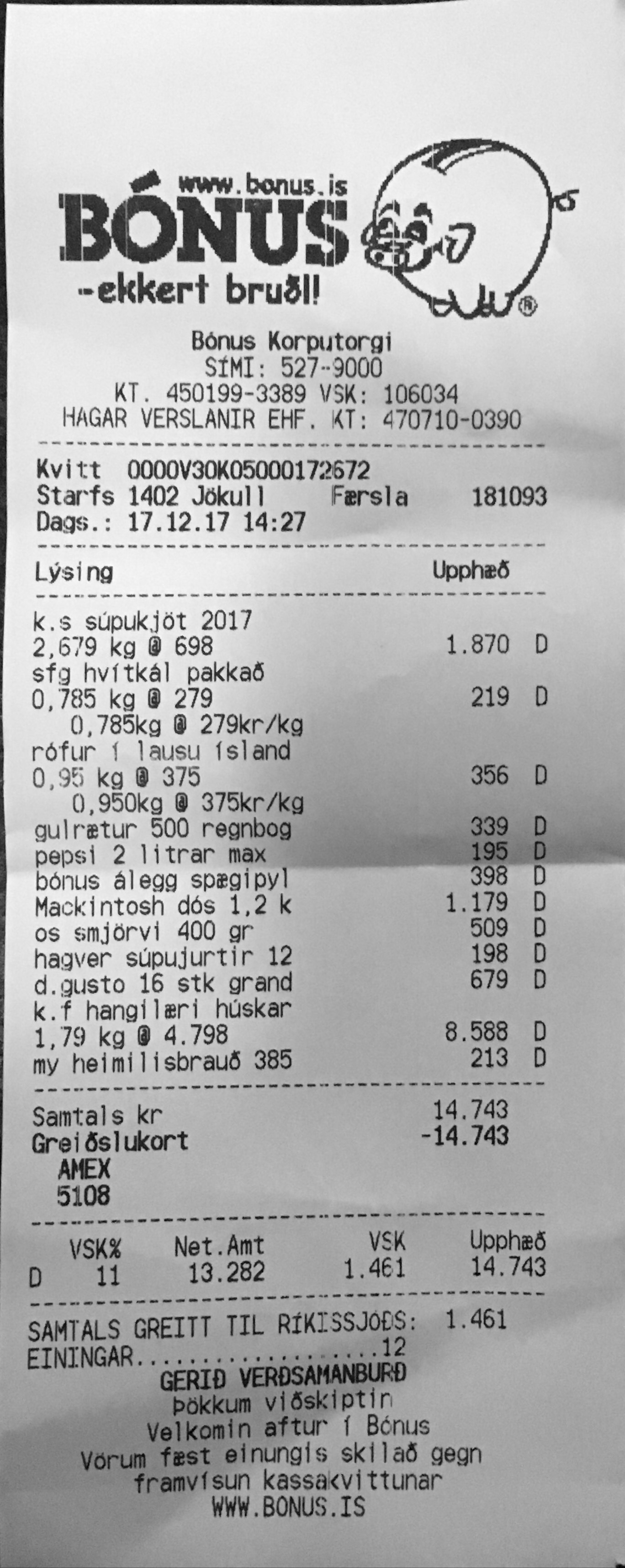 | 6 | bónus álegg spægipyl | 398 | 1 | 398 | ||||
