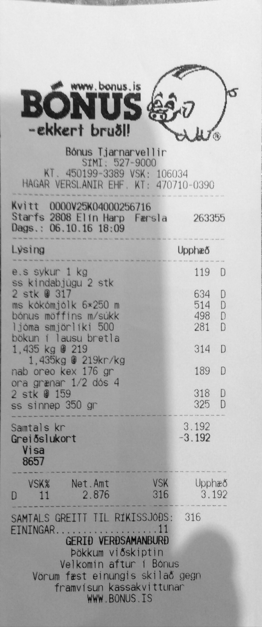 | 3 | bónus möffins m/súkk | 498 | 1 | 498 | ||||