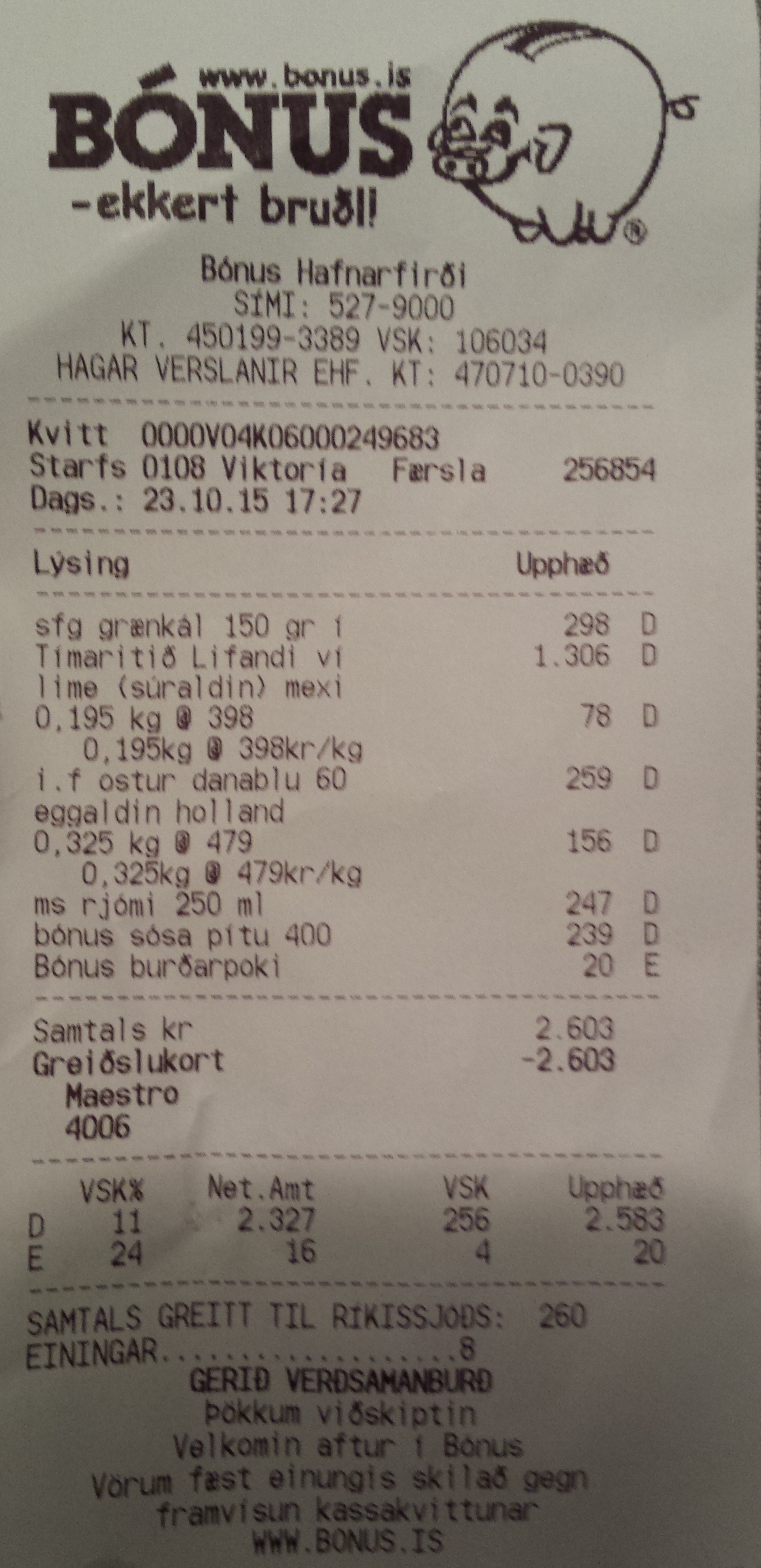 | 8 | Bónus burðarpoki | Innkaupapokar | Bónus burðarpoki | 20 | 1 | 20 | ||