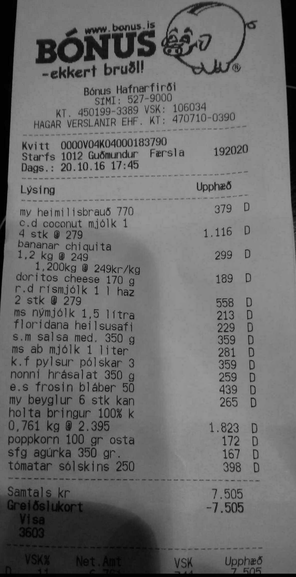| 4 | ms nýmjólk 1,5 lítra | Mjólk | MS nýmjólk 1,5L | 213 | 1 | 213 | ||