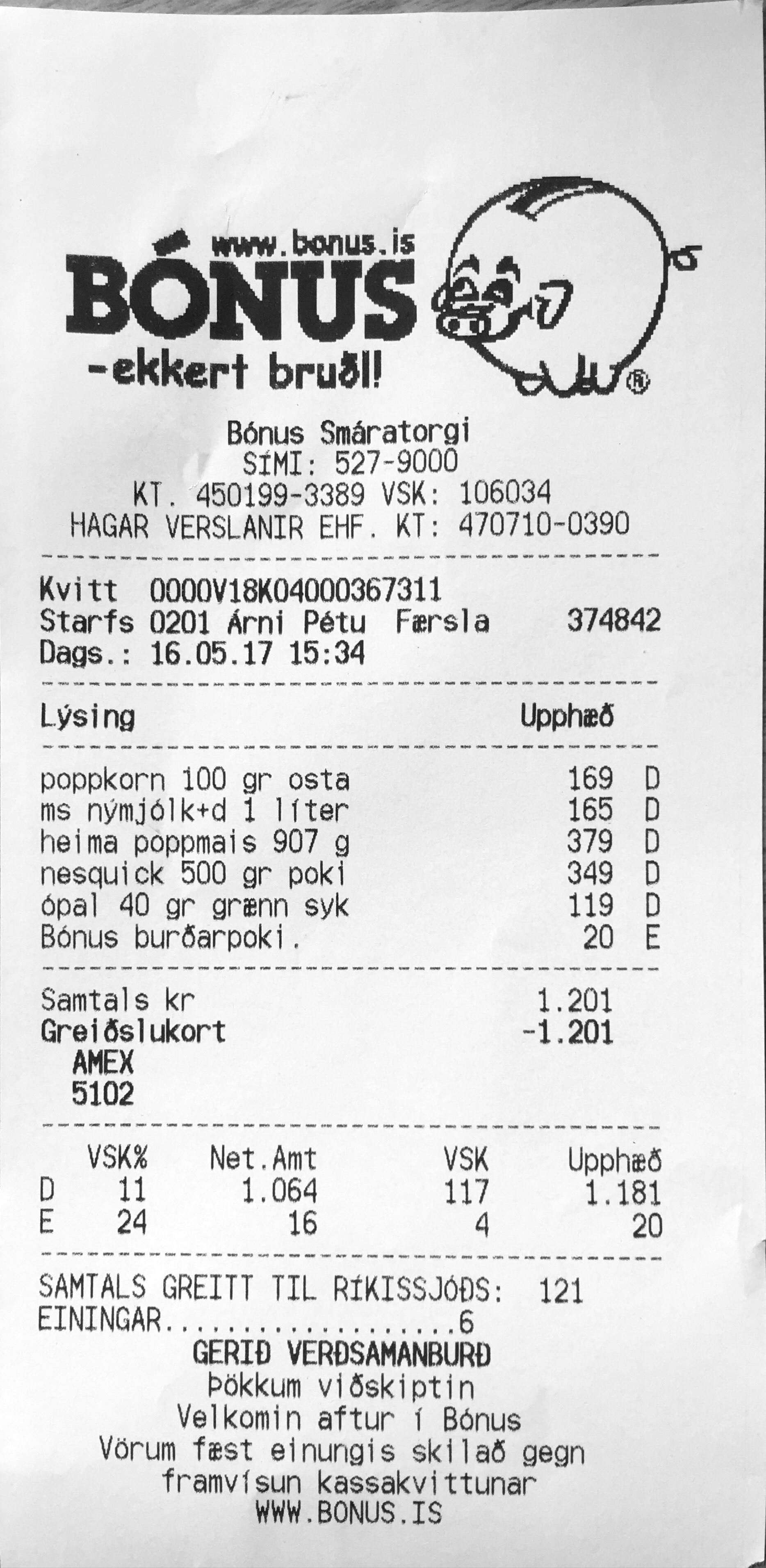 | 3 | heima poppmais 907 g | Poppmaís | 379 | 1 | 379 | |||