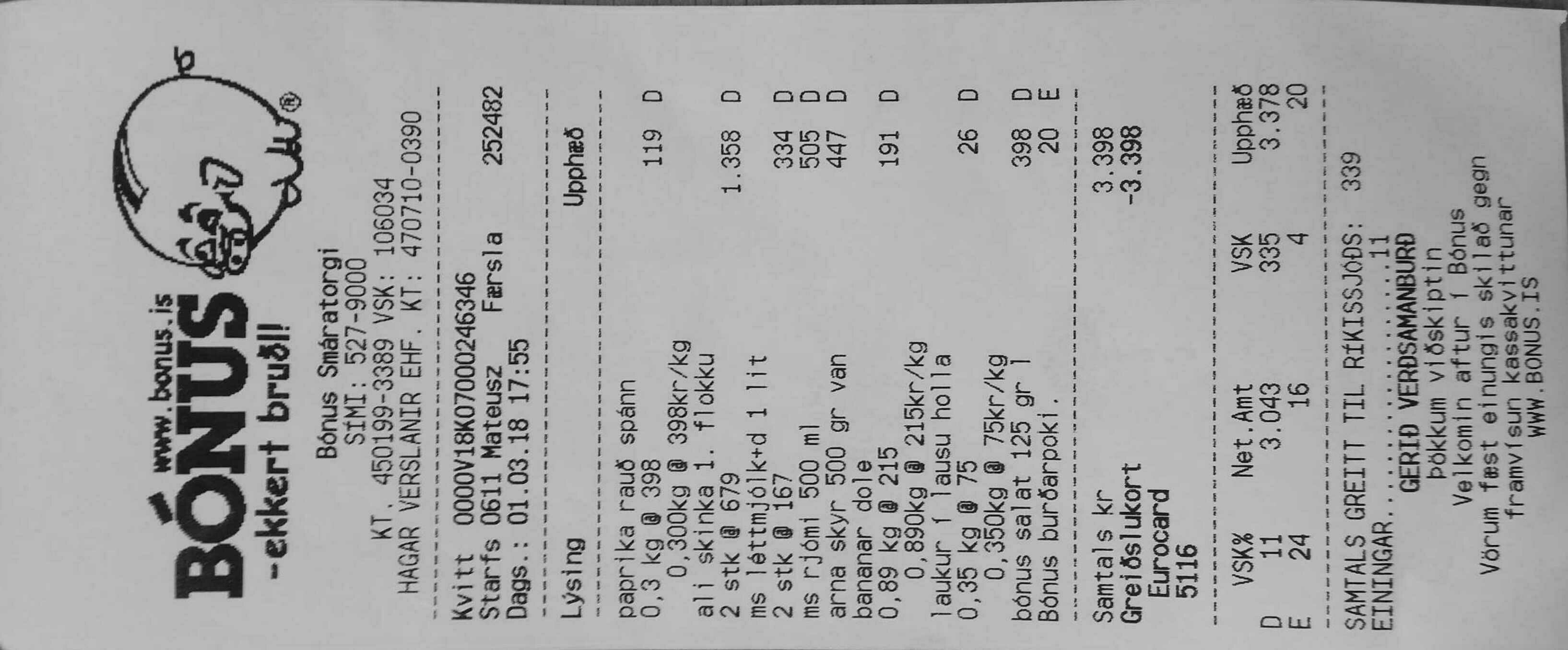 | 9 | Bónus burðarpoki. | Innkaupapokar | Bónus burðarpoki | 20 | 1 | 20 | ||