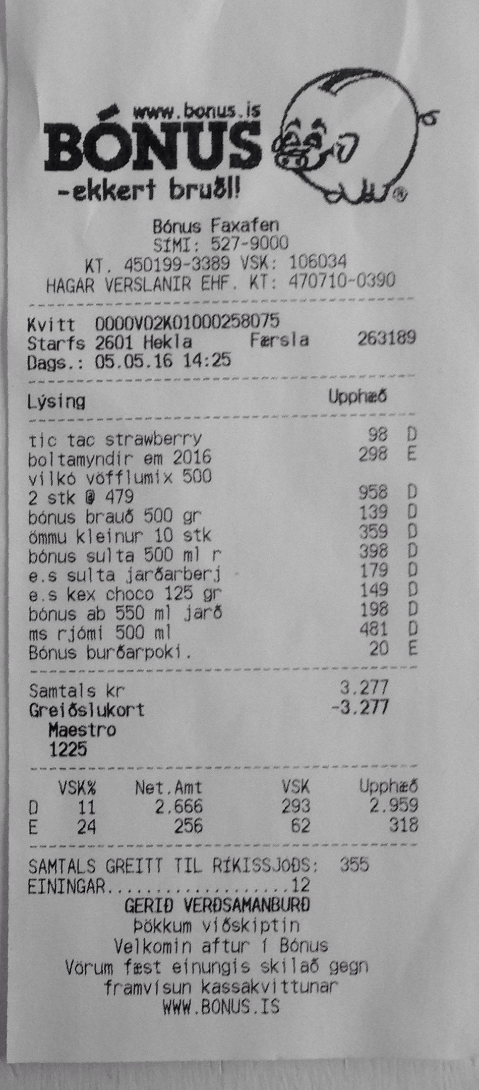 | 3 | bónus brauð 500 gr | 139 | 1 | 139 | ||||