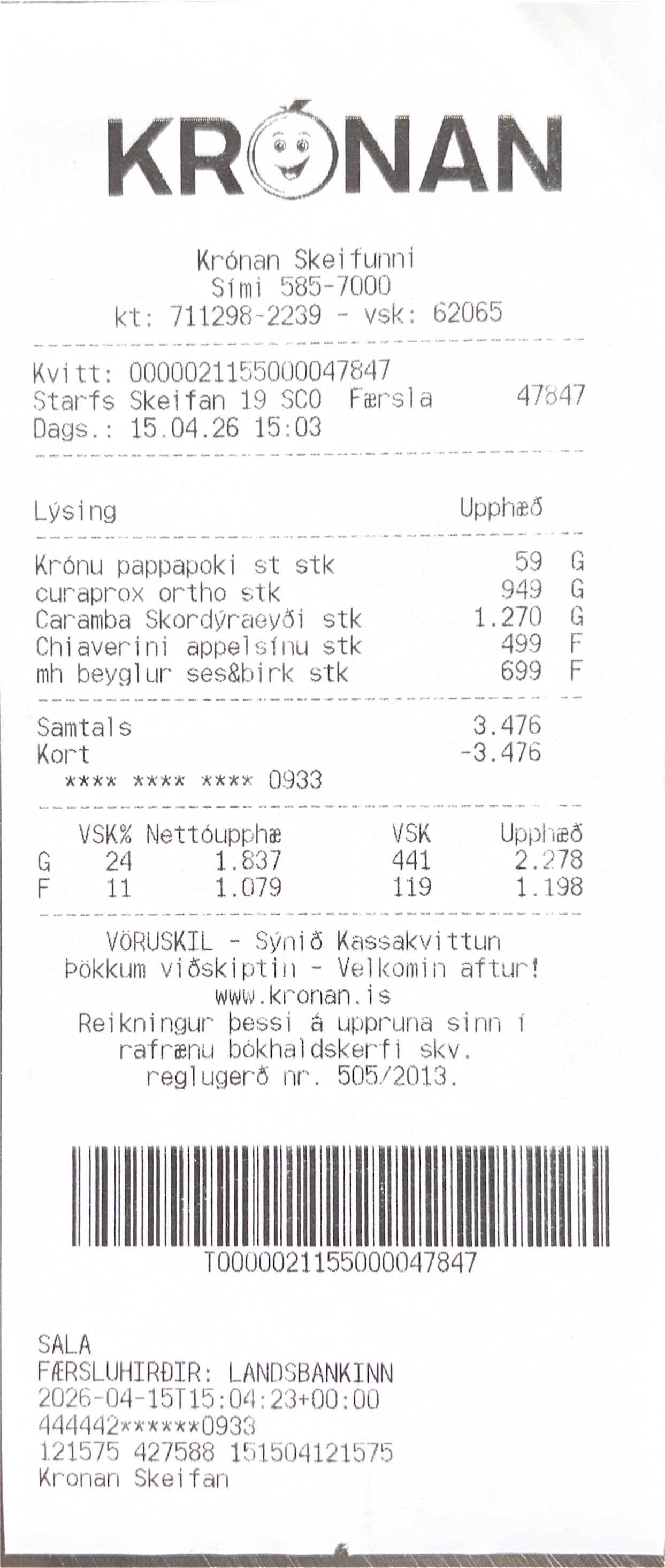 | 1 | Krónu pappapoki st | Innkaupapokar | 59 | 1 | 59 | ||||