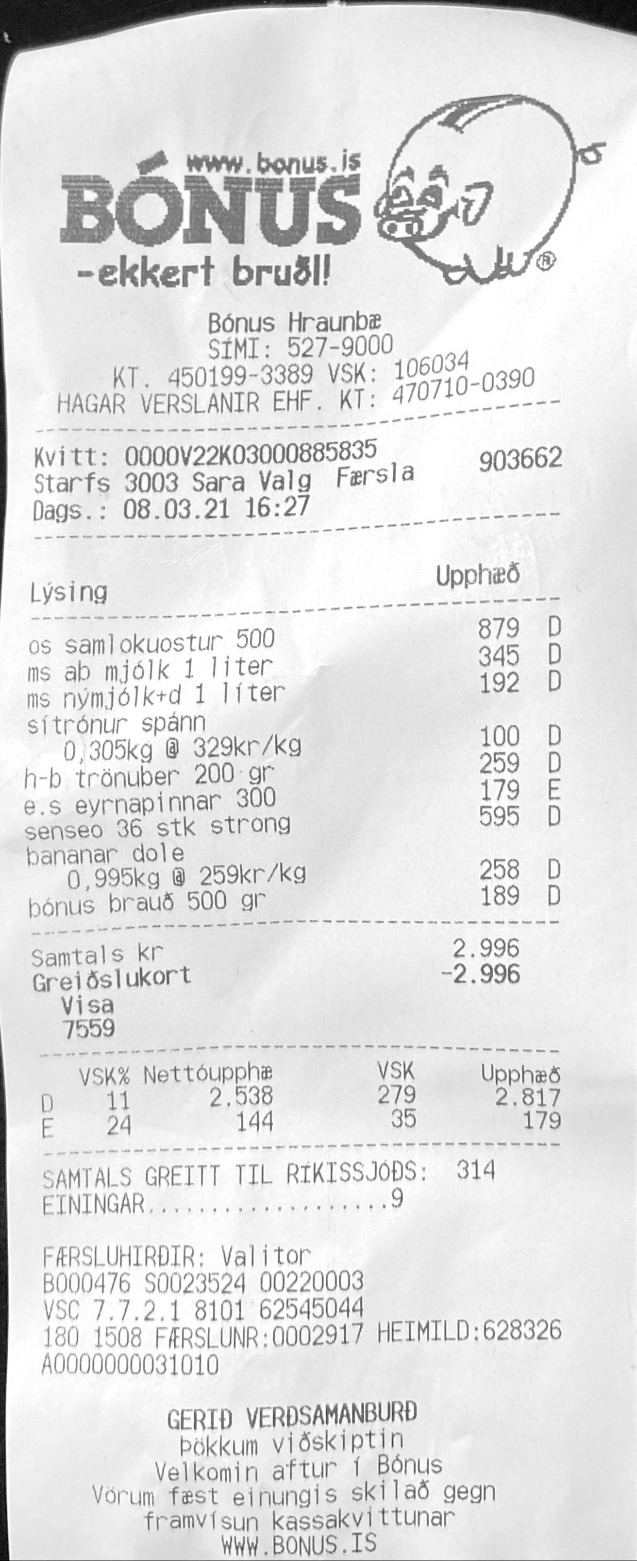 | 9 | bónus brauð 500 gr | 189 | 1 | 189 | ||||