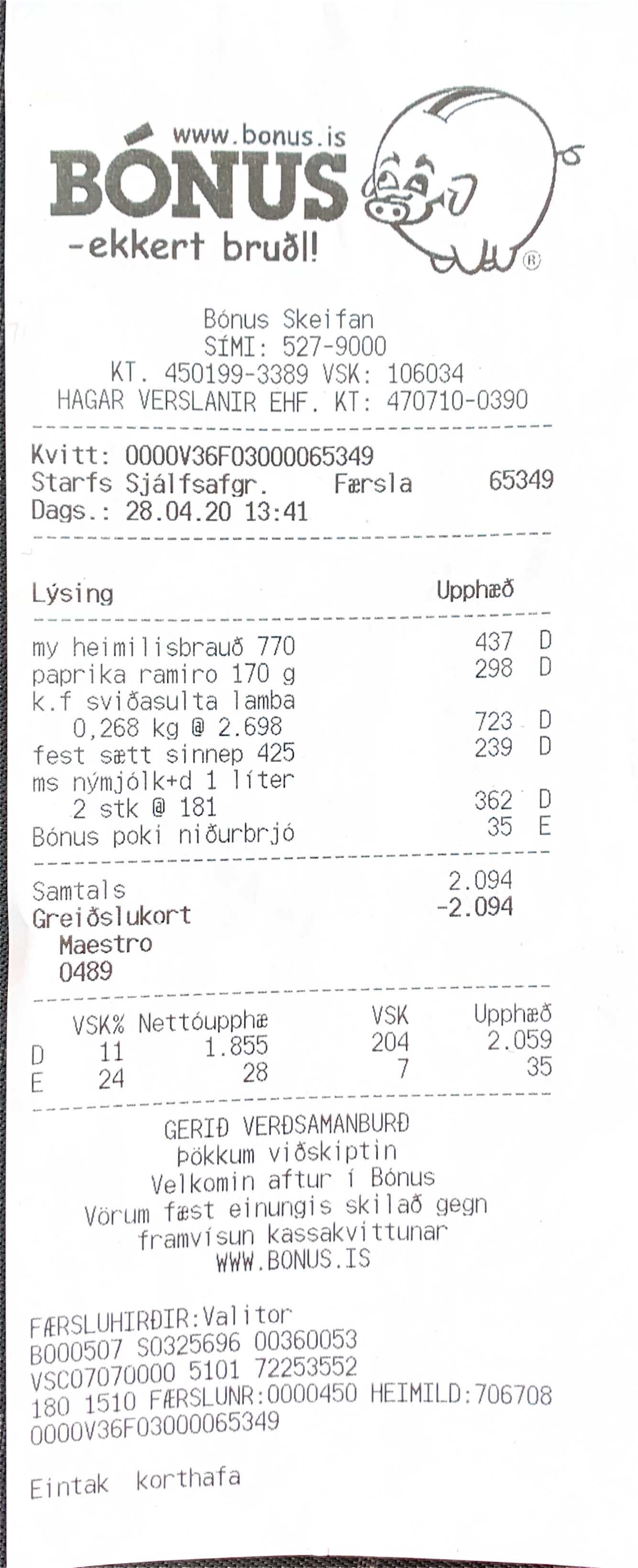 | 4 | Bónus poki niðurbrjó | Innkaupapokar | 35 | 1 | 35 | |||