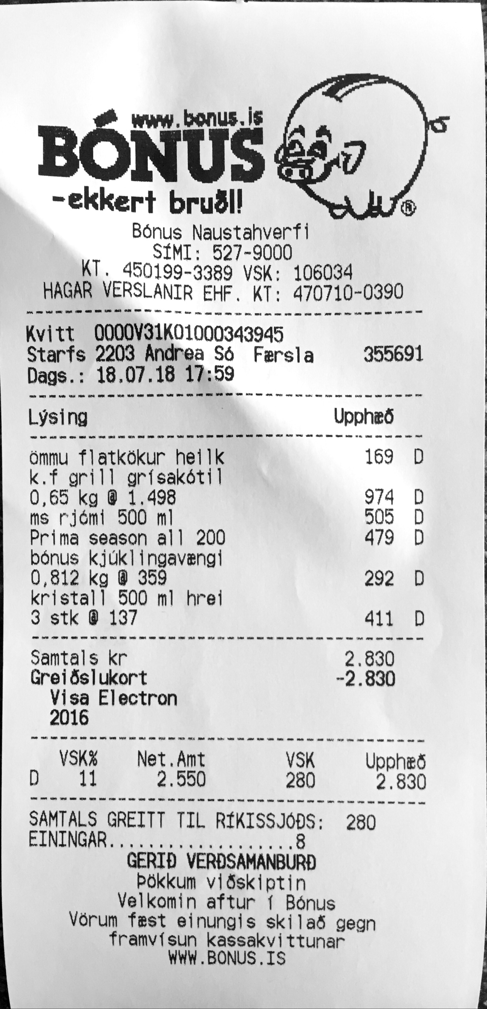 | 3 | MS Rjómi 500 ml | Rjómi | MS rjómi 500 ml | 505 | 1 | 505 | ||