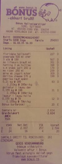 | 10 | Bónus burðarpoki | Innkaupapokar | Bónus burðarpoki | 20 | 1 | 20 | ||