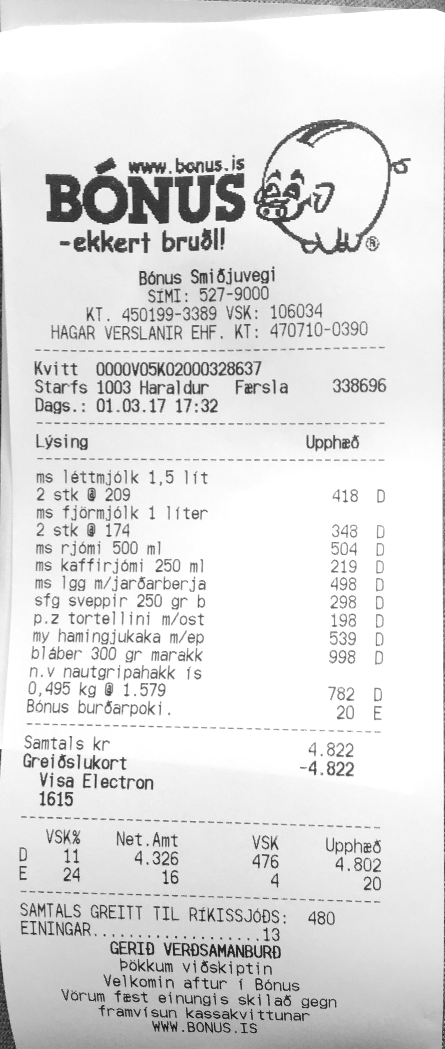 | 11 | Bónus burðarpoki. | Innkaupapokar | Bónus burðarpoki | 20 | 1 | 20 | ||