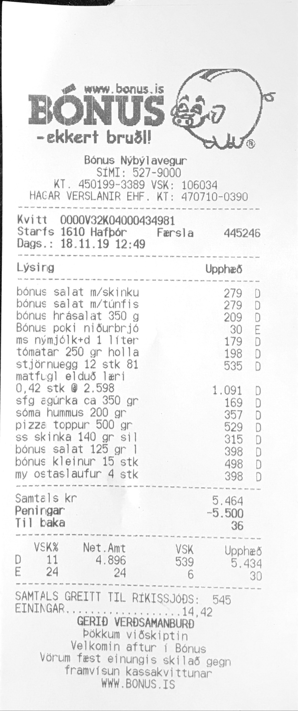 | 1 | ms nýmjólk+d 1 líter | Mjólk | MS nýmjólk, D-vítamínbætt 1L | 179 | 1 | 179 | ||