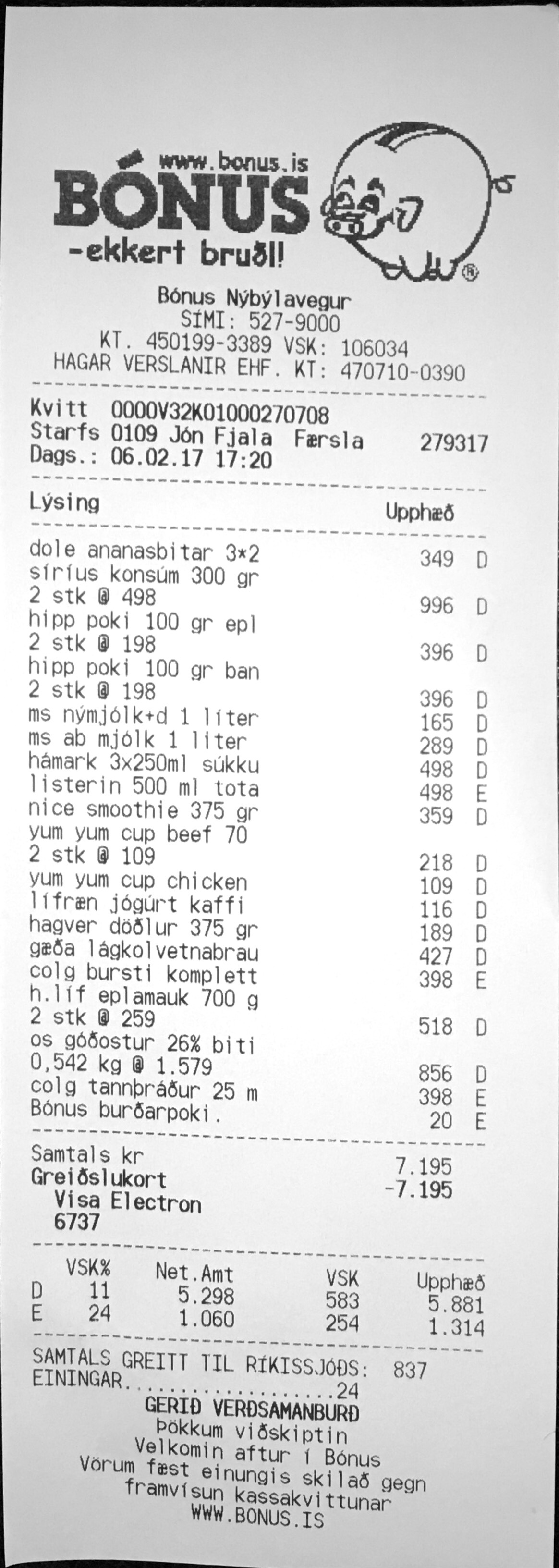 | 18 | Bónus burðarpoki. | Innkaupapokar | Bónus burðarpoki | 20 | 1 | 20 | ||