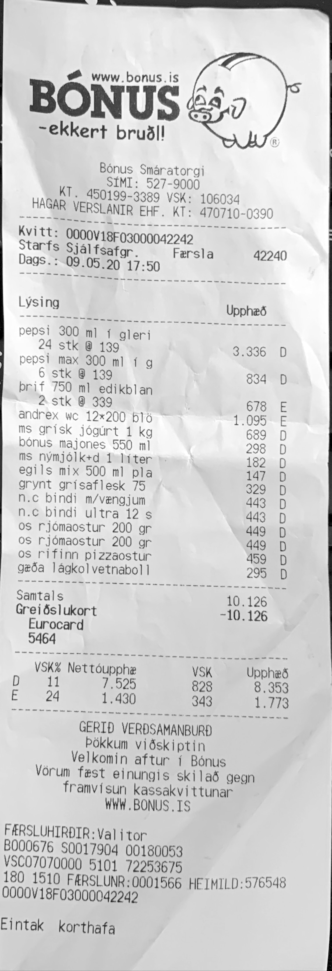 | 6 | ms nýmjólk+d 1 líter | Mjólk | MS nýmjólk, D-vítamínbætt 1L | 182 | 1 | 182 | ||