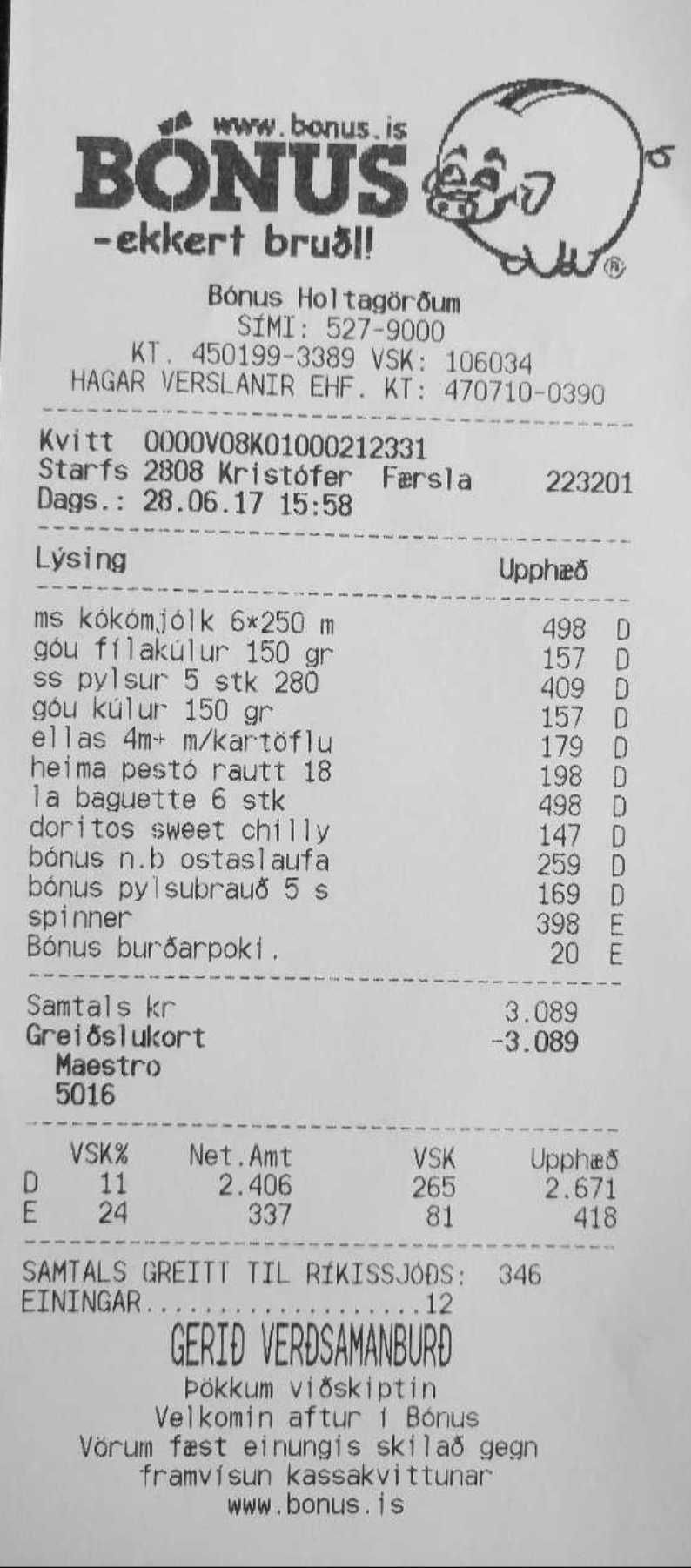 | 7 | Bónus burðarpoki. | Innkaupapokar | Bónus burðarpoki | 20 | 1 | 20 | ||