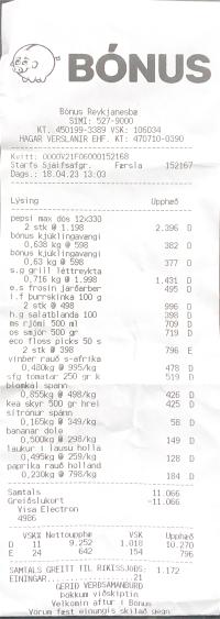 | 1 | pepsi max dós 12x330 | Pepsi Max | Pepsi Max dósir 12x330ml | 1.198 | 2 | 2.396 | ||