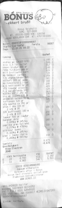 | 4 | ms nýmjólk+d 1 líter | Mjólk | MS nýmjólk, D-vítamínbætt 1L | 189 | 1 | 189 | ||