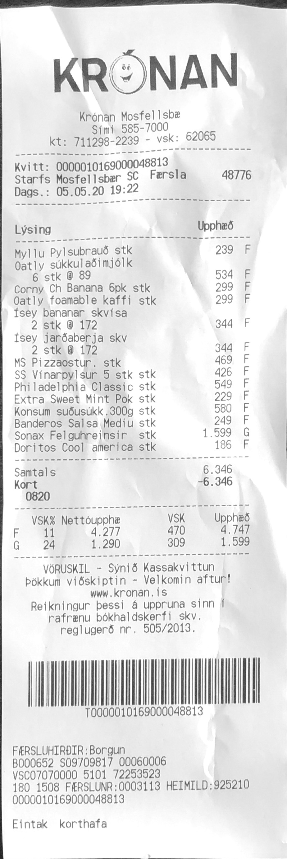 | 1 | Myllu pylsubrauð pk | Pylsubrauð | Myllan pylsubrauð 5stk 260g | 239 | 1 | 239 | ||