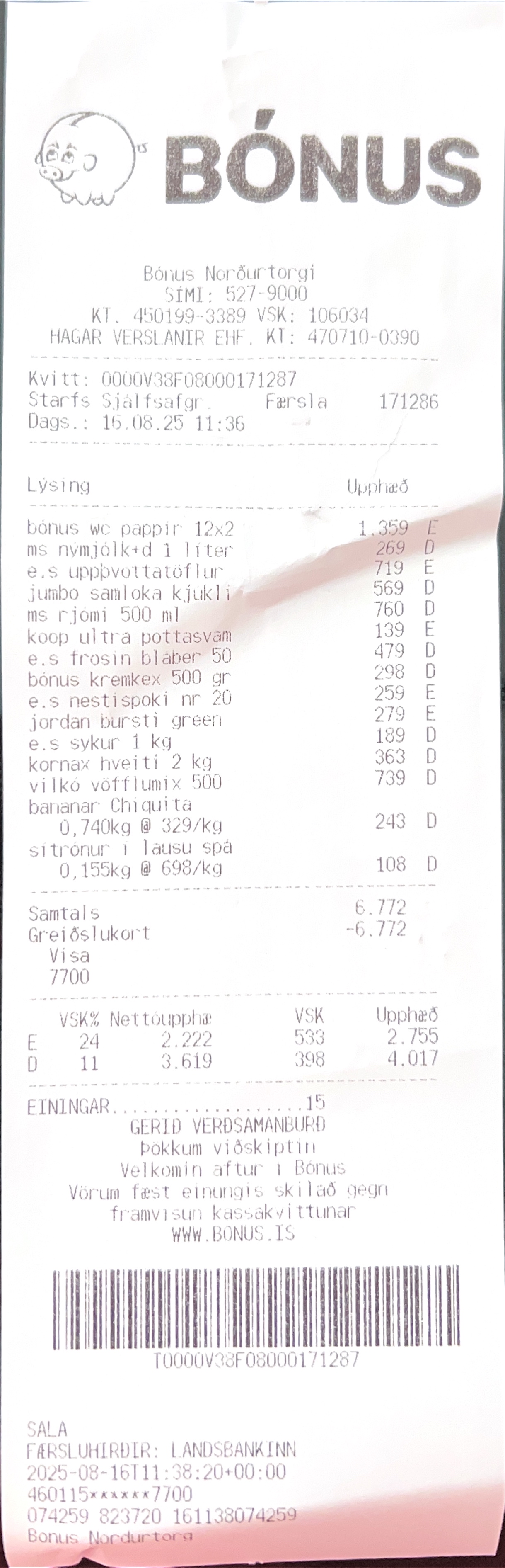 | 1 | bónus wc pappír 12x2 | Klósettpappír | 1.359 | 1 | 1.359 | |||