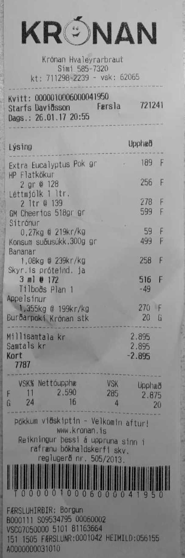 | 3 | Léttmjólk 1 ltr. | Mjólk | MS léttmjólk 1L | 139 | 2 | 278 | ||