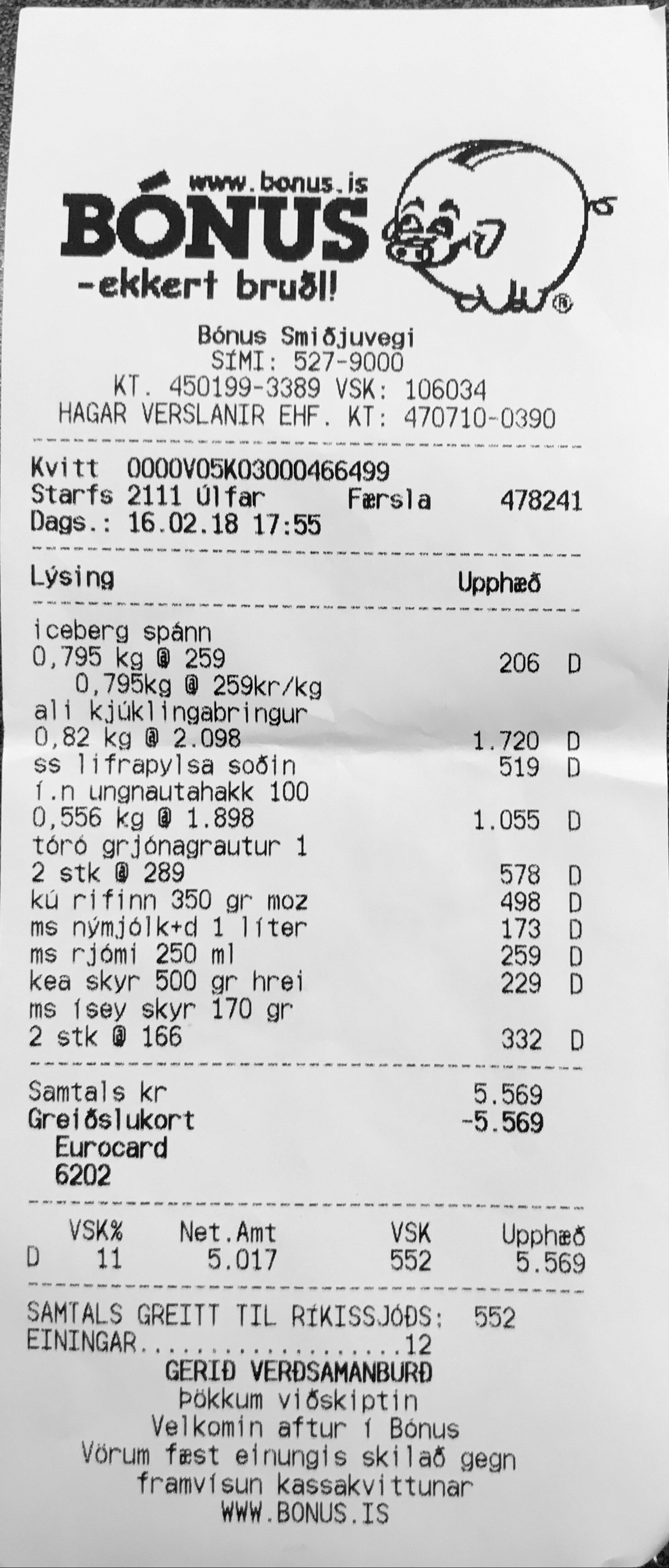 | 7 | ms nýmjólk+d 1 líter | Mjólk | MS nýmjólk, D-vítamínbætt 1L | 173 | 1 | 173 | ||