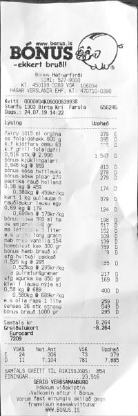 | 16 | Bónus brauð 1000 gr | Brauð | Bónus kornbrauð, 1kg | 295 | 1 | 295 | ||