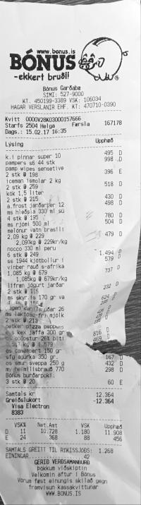 | 7 | Bónus burðarpoki. | Innkaupapokar | Bónus burðarpoki | 20 | 3 | 60 | ||