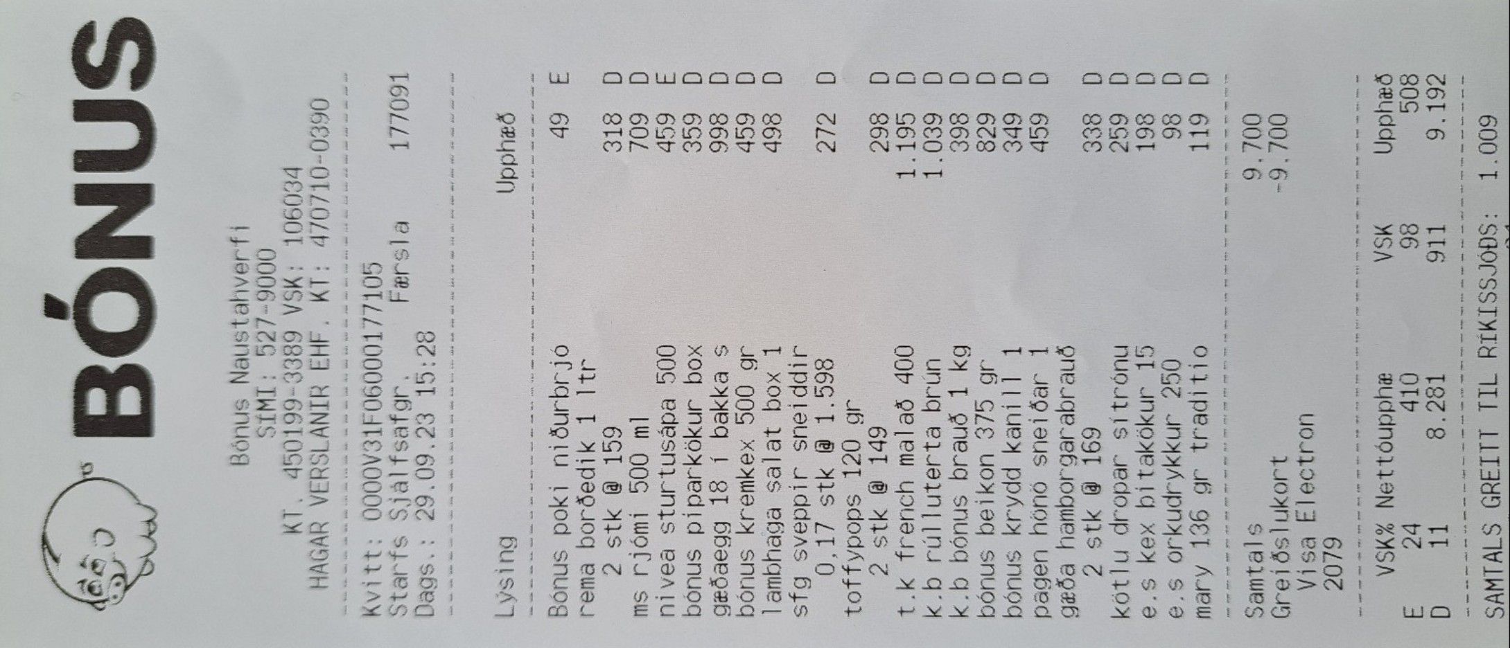 | 1 | bónus poki niðurbrjó | Innkaupapokar | 49 | 1 | 49 | |||