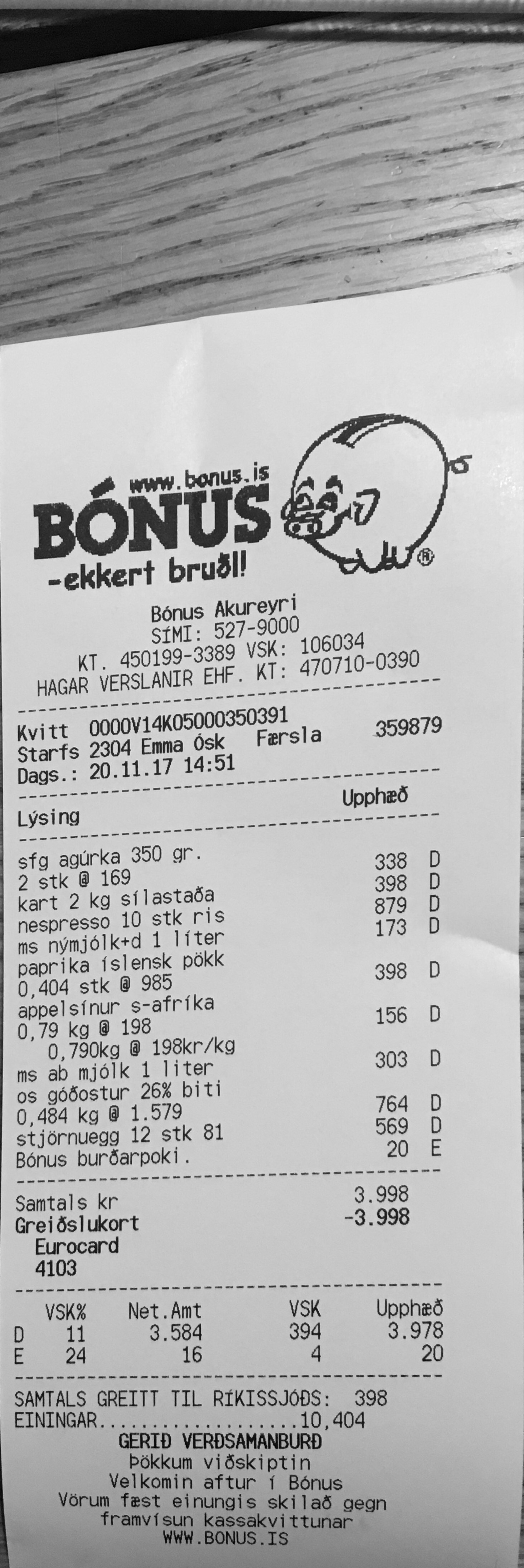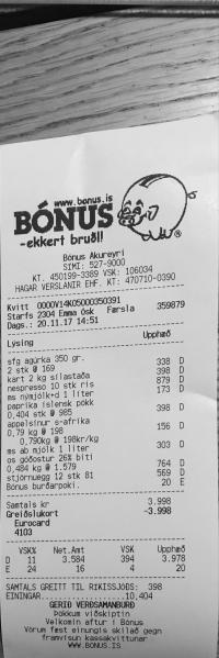 | 7 | Bónus burðarpoki. | Innkaupapokar | Bónus burðarpoki | 20 | 1 | 20 | ||