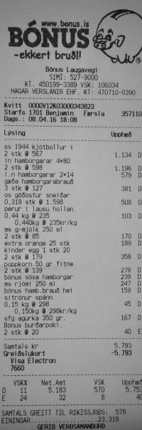 | 13 | Bónus burðarpoki | Innkaupapokar | Bónus burðarpoki | 20 | 2 | 40 | ||