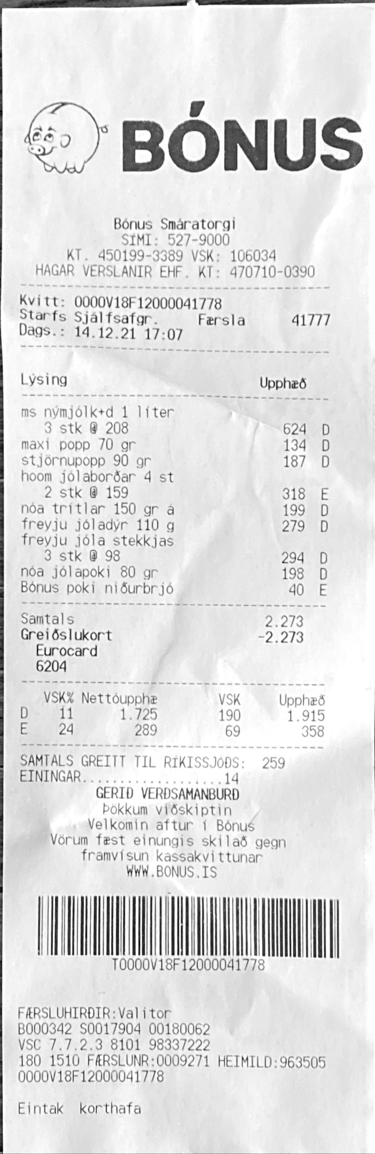 | 5 | Bónus poki niðurbrjó | Innkaupapokar | 40 | 1 | 40 | |||