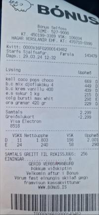 | 6 | ora grænar 420 gr | Grænar baunir, niðursoðnar | Ora grænar baunir, 420g | 229 | 1 | 229 | ||